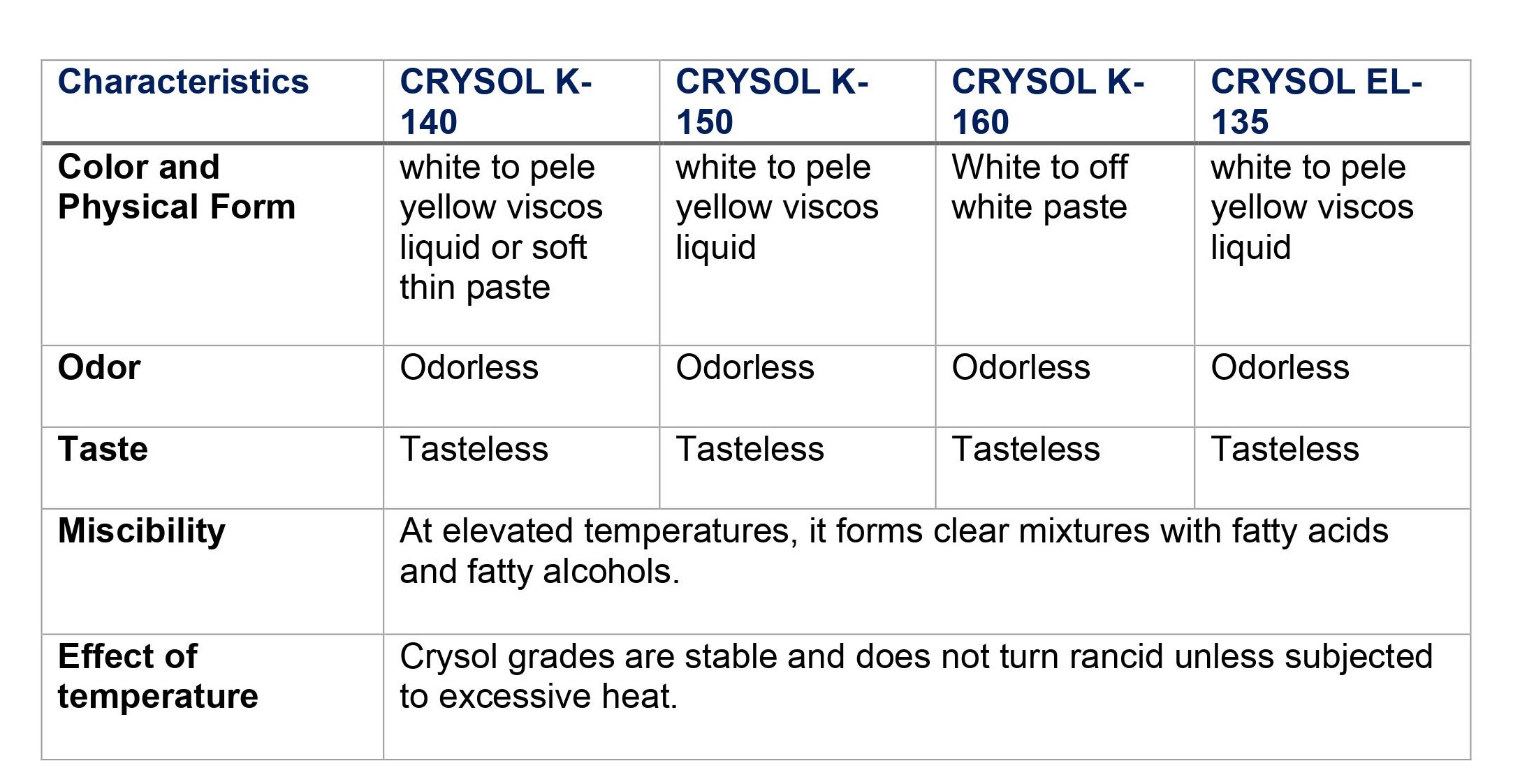 Crysol grades are chemically castor oil derivatives. They are almost tasteless and odorless.